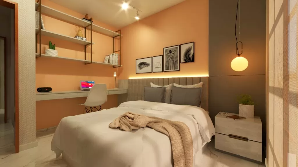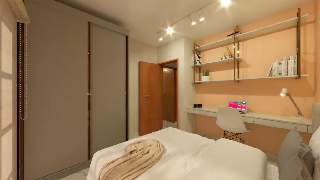 O dormitório de visitas conta com cama de casal e uma grande bancada para estudo/trabalho, já que quando não em uso de visitas, servira como espaço de trabalho home office do casal morador.