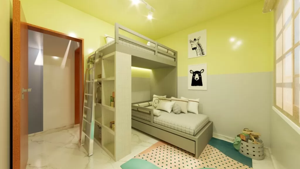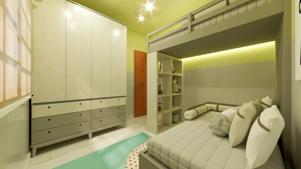 O dormitórios das crianças conta com uma beliche que, sendo que seu apoio serve como estante para os brinquedos, dividido em vários nichos para organização do espaço. Roupeiro compartilhado com uma estética mais simples, para atender a função do espaço. Por ser um pequeno dormitório, só com projeto de móveis sob medida conseguimos otimizar seu espaço.