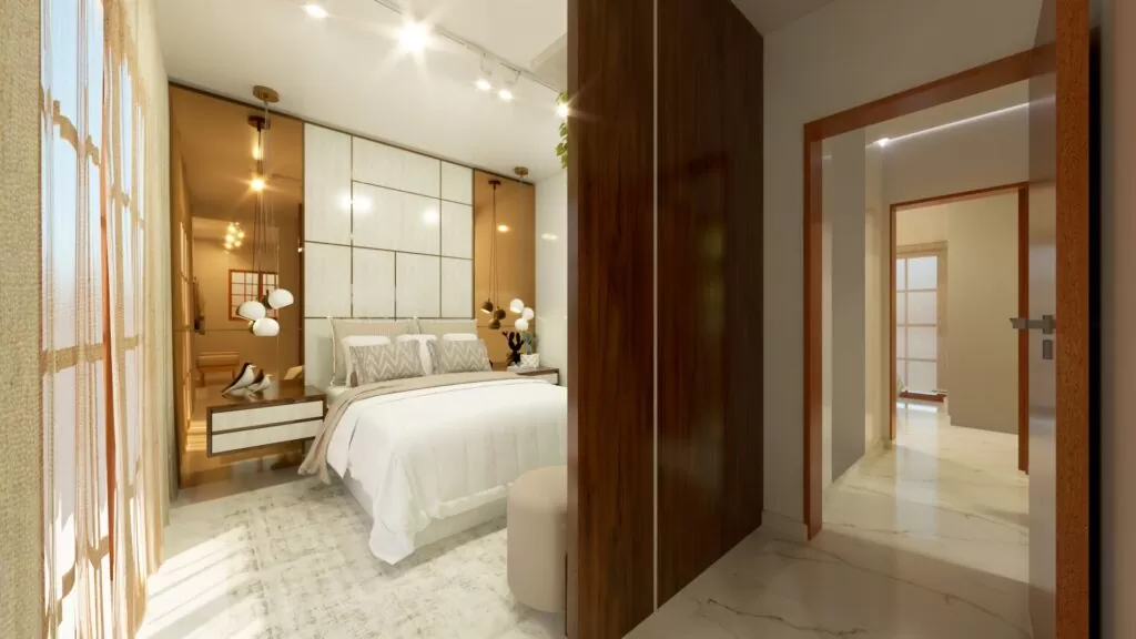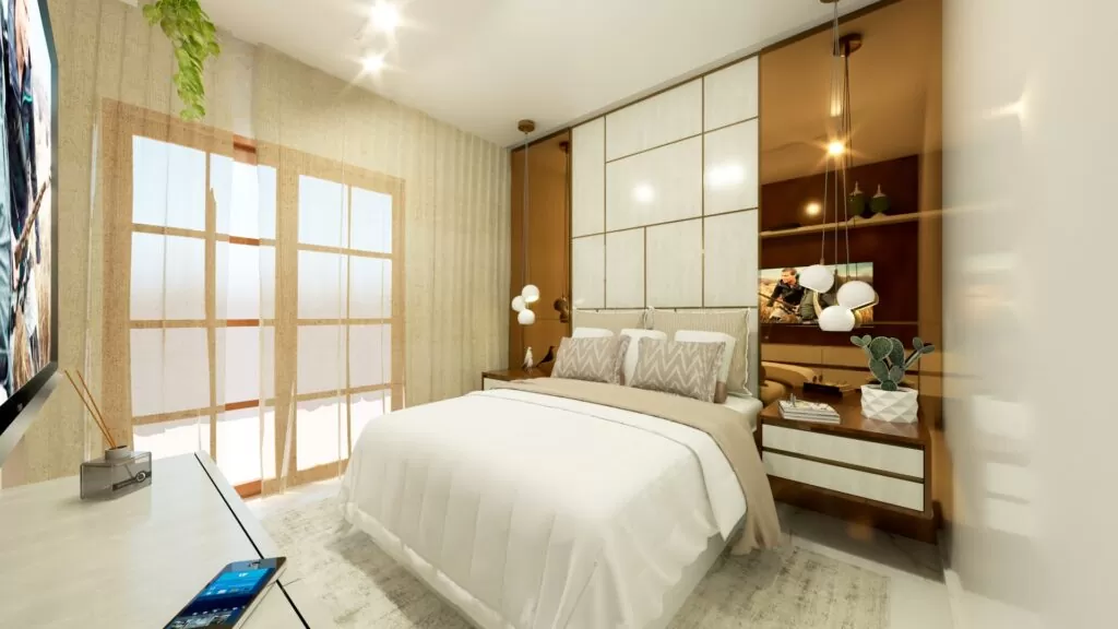 A suíte do casal conta com um grande closet e um dormitório com espaço para TV. Na cabeceira imponente, usamos espelho reflecta bronze, demarcando as laterais da cama, refletindo a luz das pendentes.
