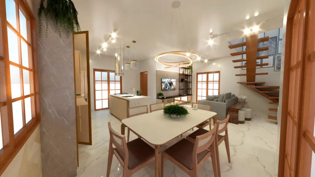 No térreo, com lavabo, sala de estar, jantar, cozinha e área de serviço, muito integrado entre sí, onde quem está jantando consegue ver TV, e quem está na sala interagem com o jantar e cozinha. Um espaço realmente para valorizar o convívio familiar.