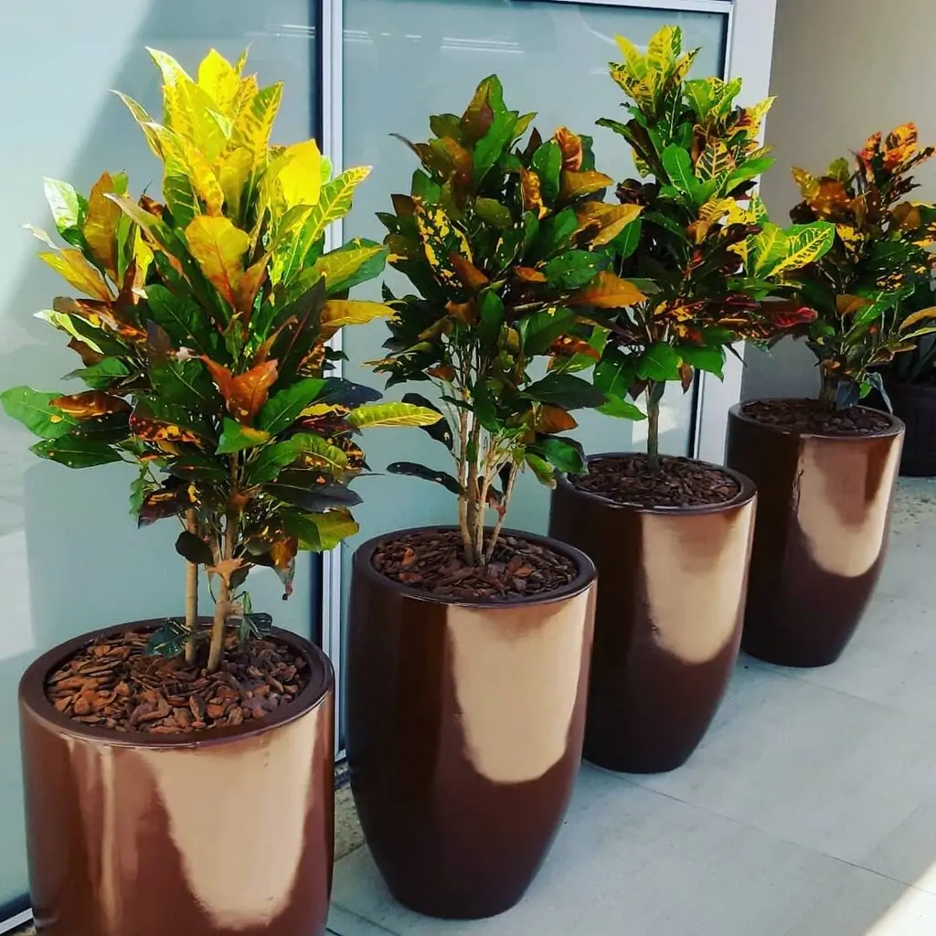 Grandes folhas coloridas com tons de branco, vermelho, amarelo, roxo, verde ou rosa são a marca do Cróton. Necessita de luz solar para permanecerem belas e brilhantes, por isso é interessante mantê-las próximas às janelas. Outra dica importante sobre essa planta é que ela não combina com ambientes de ar condicionado.