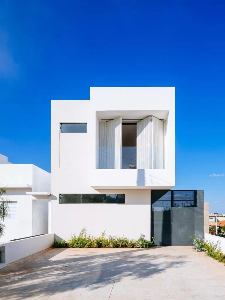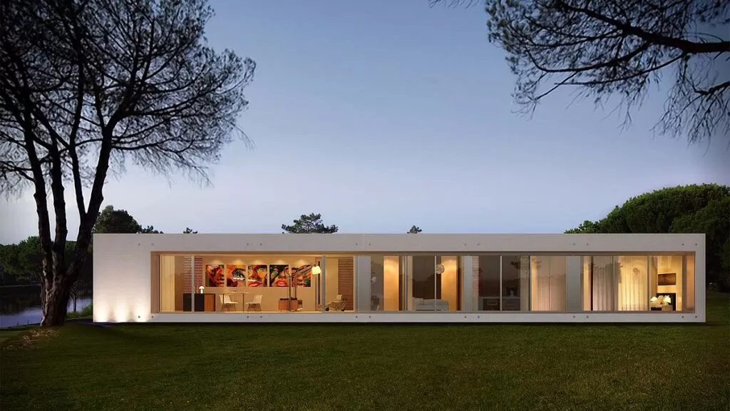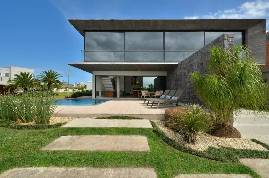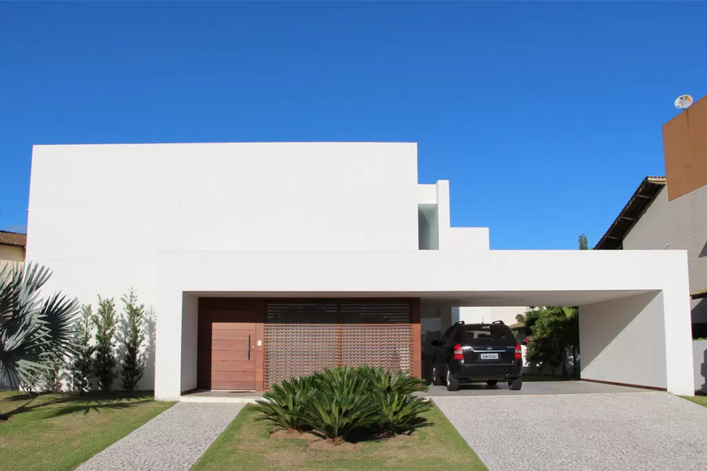 Nas casas de arquitetura moderna podemos perceber as formas geométricas retas e marcadas. Outra característica típica é o uso expressivo de concreto e vidro. Desde a fachada é comum o uso de uma composição clássica de cores, como preto e branco. As janelas costumam ser de fita – janelas que não possuem interrupções no seu interior – estas privilegiam o conforto térmico e trazem mais luminosidade aos ambientes. Ainda neste estilo, é frequente o uso de Pilotis – pilares no térreo – o que naturalmente proporciona um espaço mais livre visualmente. É uma ótima opção tanto para quem dispõe de um orçamente mais alto como mais baixo, permitindo através do estilo moderno construir desde casas menores até mansões.