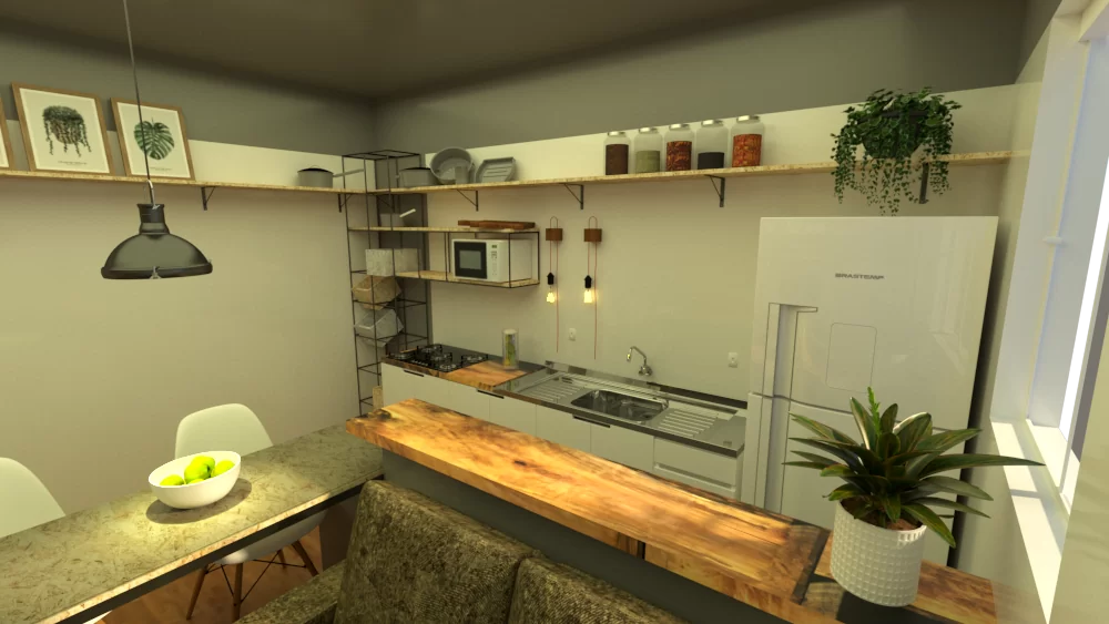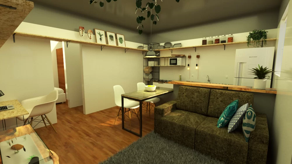 Relato da cliente sobre um Did yourself: “A decisão de morarmos juntos foi bem difícil, com ela veio o desejo de termos um lugar bom e aconchegante pra viver. Quando entramos em contato com o Orgânico, apenas queríamos uma ideia de como adaptar os móveis em apenas 3 peças (quarto, banheiro e sala/cozinha) sem gastar com grandes obras. No fim, quando surgiram as imagens e o projeto por ele elaborados, foi uma surpresa ver como ele conseguiu compreender nossa forma de ser e principalmente de viver. Simples, rústico, mas com um toque diferenciado, em que cada coisa pudesse ser feita por nós mesmos. Aceitamos de cara e ele nos motivou, pesquisou detalhes, deu dicas de materiais e de como confeccionar cada peça do mobiliário, e da própria casa que teve alguns ajustes.
