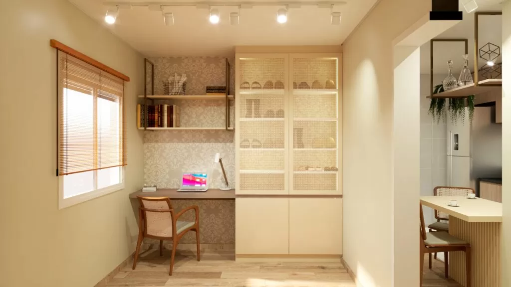 Já para o quarto, que atende ao uso mais o espaço coringa para trabalho que complementa o trabalho fora da casa. Utiliza a mesma estética da sala: metalon e chapas de MDF bege e marrom.