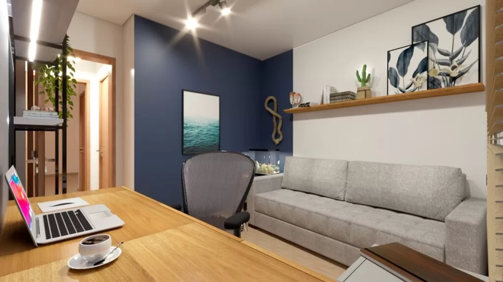 Para o espaço de home office, um quarto coringa, onde o sofá pode ser aberto e utilizado como cama. Mas que durante o período normal, uma bancada confortável atende as demandas de trabalho, com prateleiras abertas para livros, plantas e decoração.