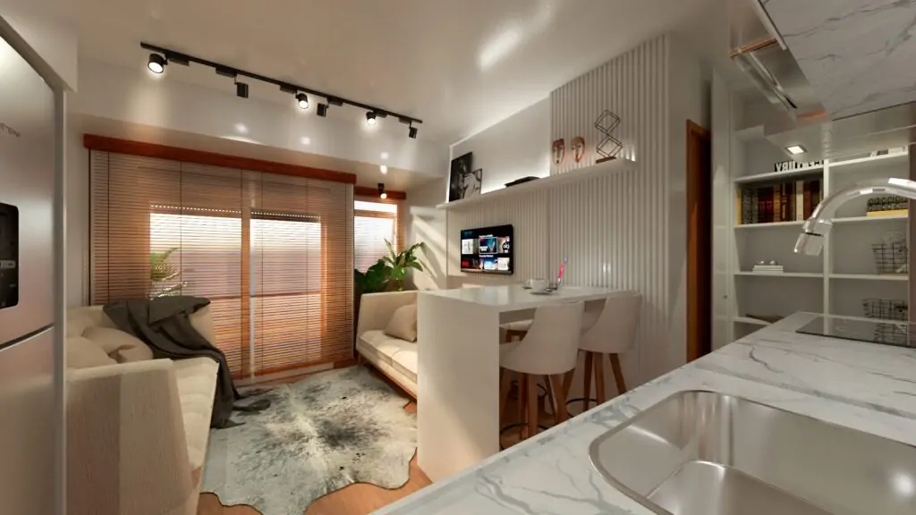 Painel ripado para a TV demarca a parede e também o local da bancada alta, que pode ser movimentada para ganhar mais espaço.