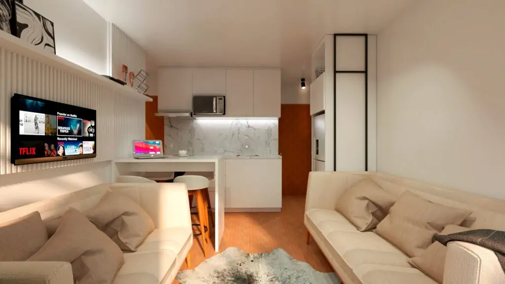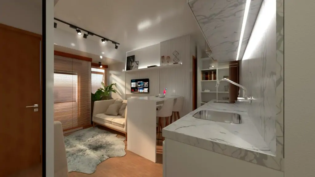Com proposta clean o projeto de móveis foi pensado para otimizar o máximo do pequenos espaço, e o resultado ficou demais!