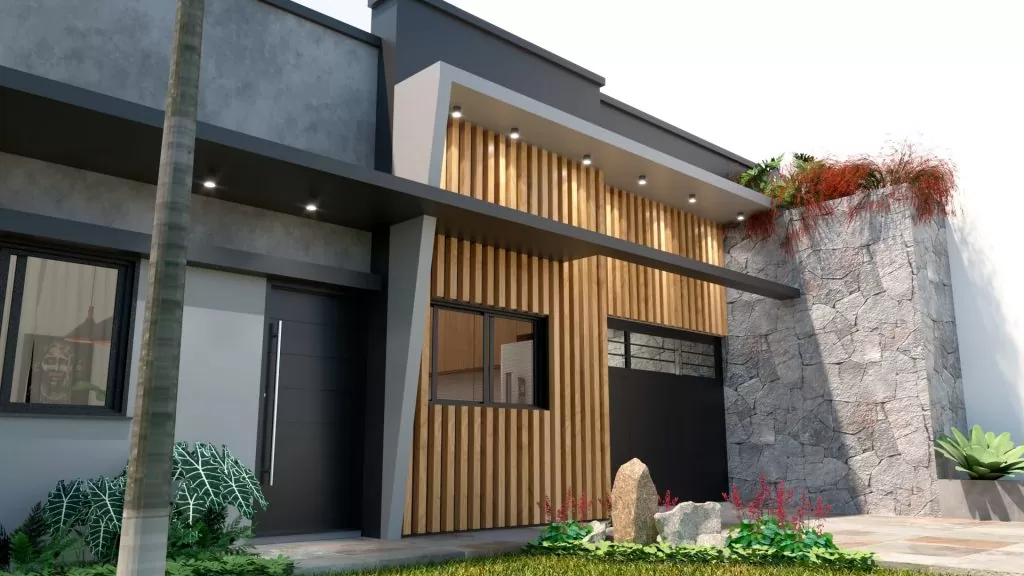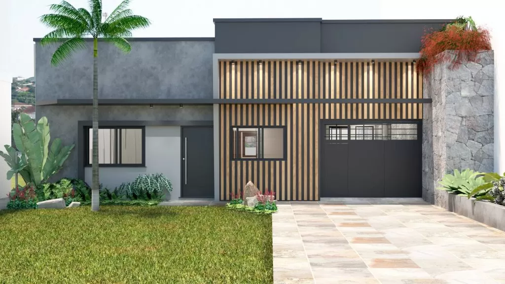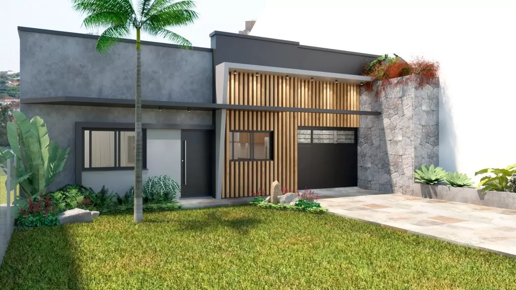 A fachada da casa com elementos contemporâneos como madeira, pedra, cimento queimado e tons cinzas. Isso somado ao paisagismo e a palmeira existente, já apresenta atmosfera do novo lar.