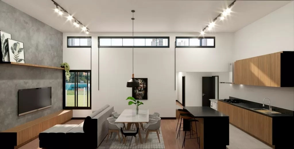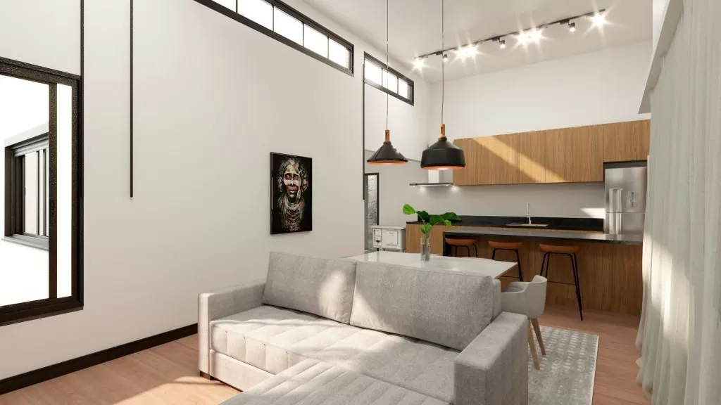 Ainda na área social, o pé mais alto traz um mais imponência na fachada, além de possibilitar a iluminação natural indireta. Aqueles ambientes que gostamos, que nem precisam ligar a luz durante o dia.