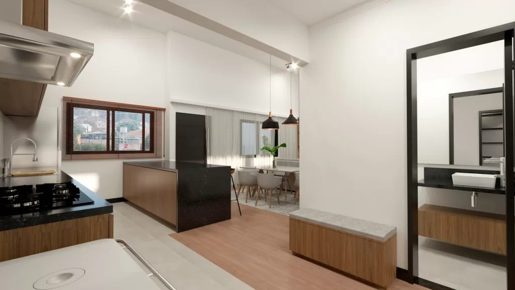 Mantemos uma planta bem funcional e setorizada, com área social na frente, área de serviço para um lado, e dormitórios para os fundos. Assim interligada pela circulação que liga todos ambientes.