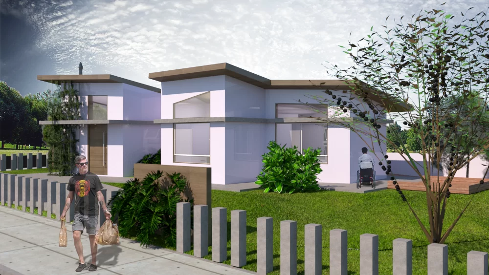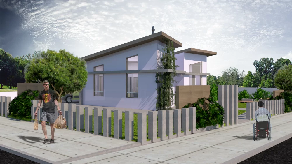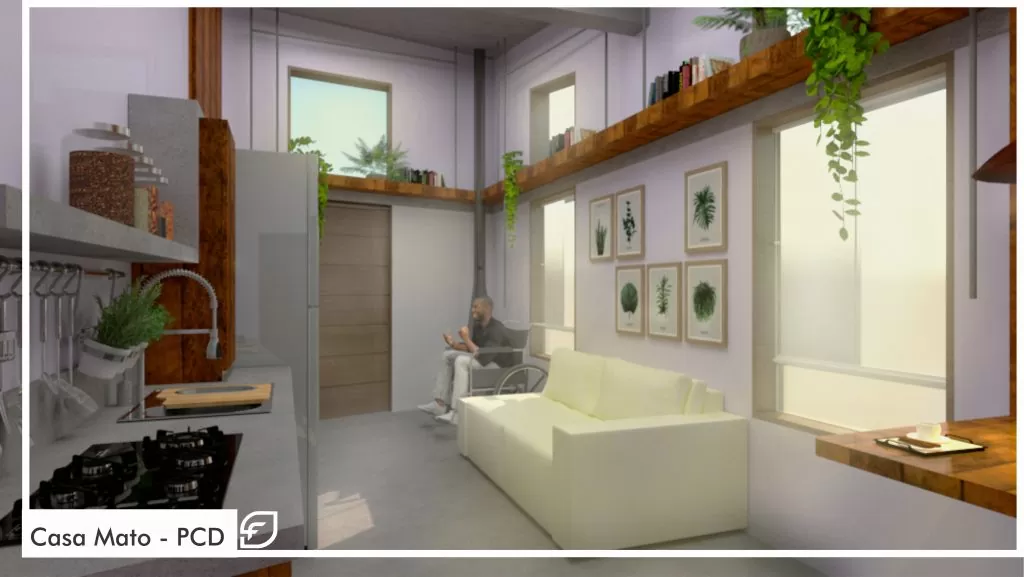 Projeto de arquitetura de casa acessível para pessoa com mobilidade reduzida (cadeira de rodas). A proposta conta com dois dormitórios, banheiro, sala e cozinha e área de serviço aberta. Planejada para dar plena liberdade e independência para usuário com mobilidade reduzida.