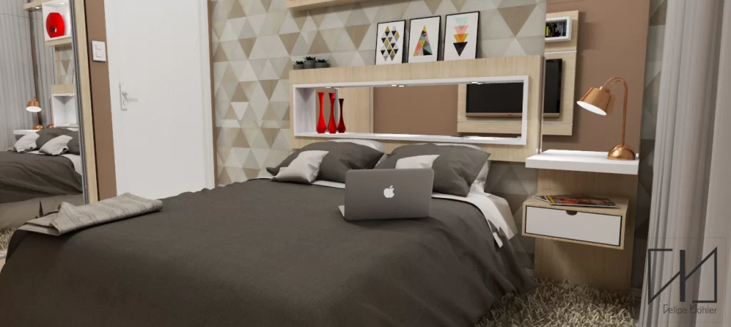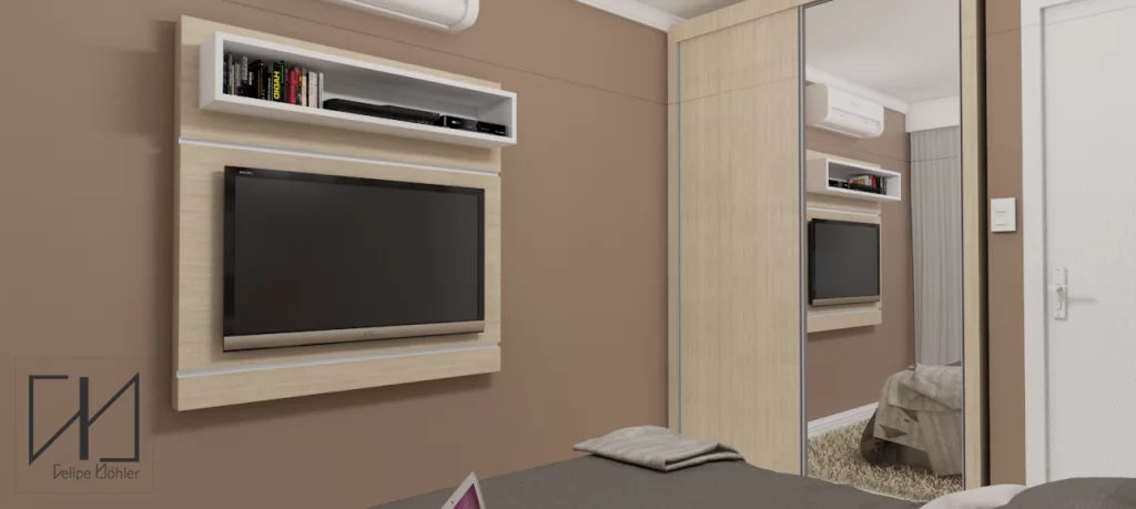 O fluxo do dormitório também poderia ser invertido, com a TV na parede onde está a cabeceira da cama. O projeto de marcenaria possibilita essas opções de configurações do espaço.