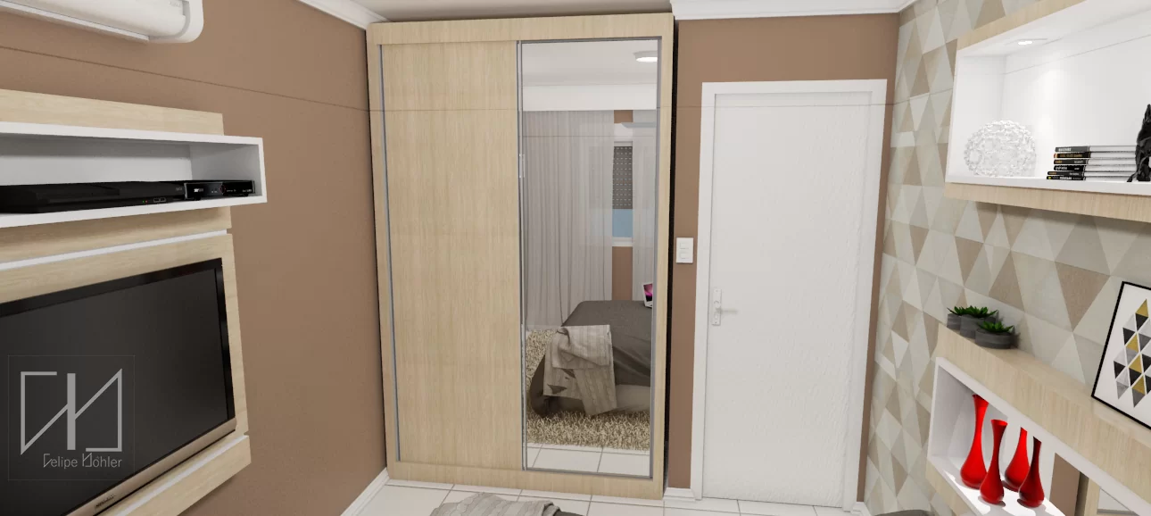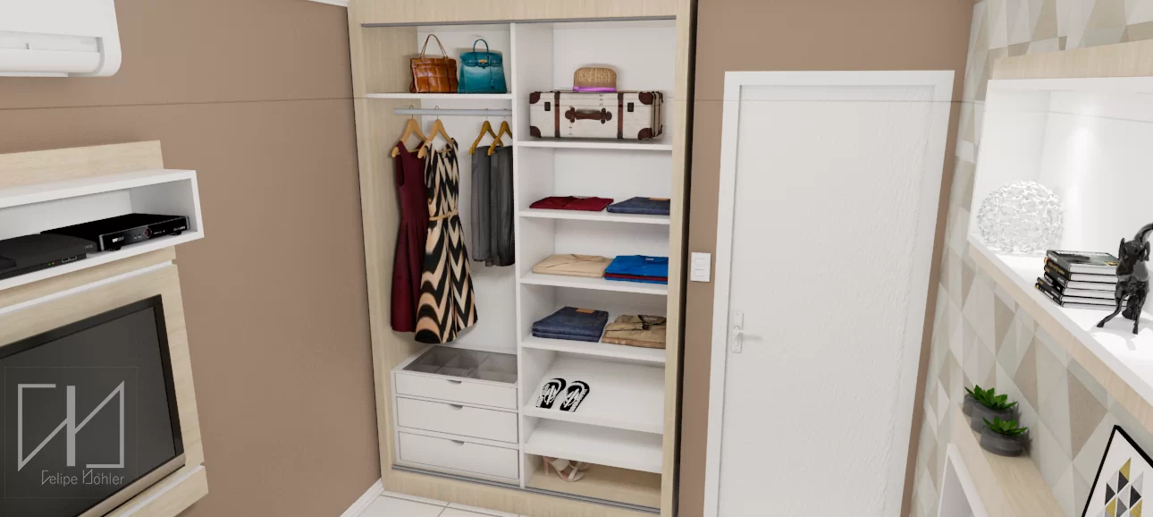 O roupeiro no projeto de marcenaria, com duas portas de deslizar, foi dividido exatamente conforme a necessidade da moradora. Com o pequeno espaço, é necessário pensar exatamente o que é prioridade para a organização das roupas, malas e demais itens pessoais.