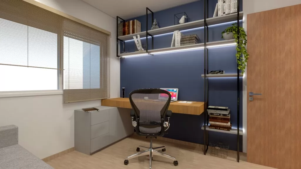 O apartamento AC tem um carinho pela vida marinha, com isso trabalhamos com tons azuis e cinza, e organizamos o espaço para receber aquários nos ambientes!
