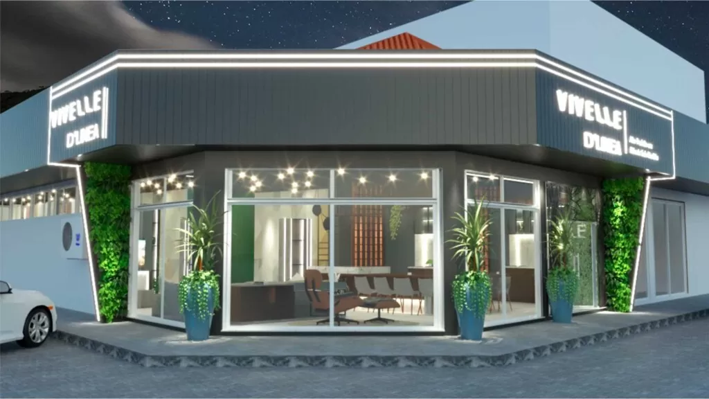A fachada comercial da nova loja da Vivelle Móveis na praia do Campeche é composta por letreiros iluminados e muita plantas para chamar atenção.