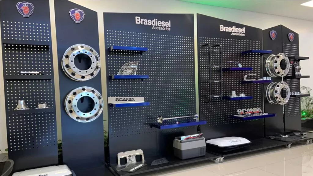 O projeto de estande industrial para Brasdiesel, concessionária da Scania, serve para os acessórios de caminhões, de forma prática e bonita!