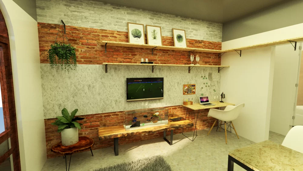 Projeto de interiores jovem para casal em seu primeiro apartamento: tijolinho, cimento aparente e textura do aço corten na chapa de MDF.