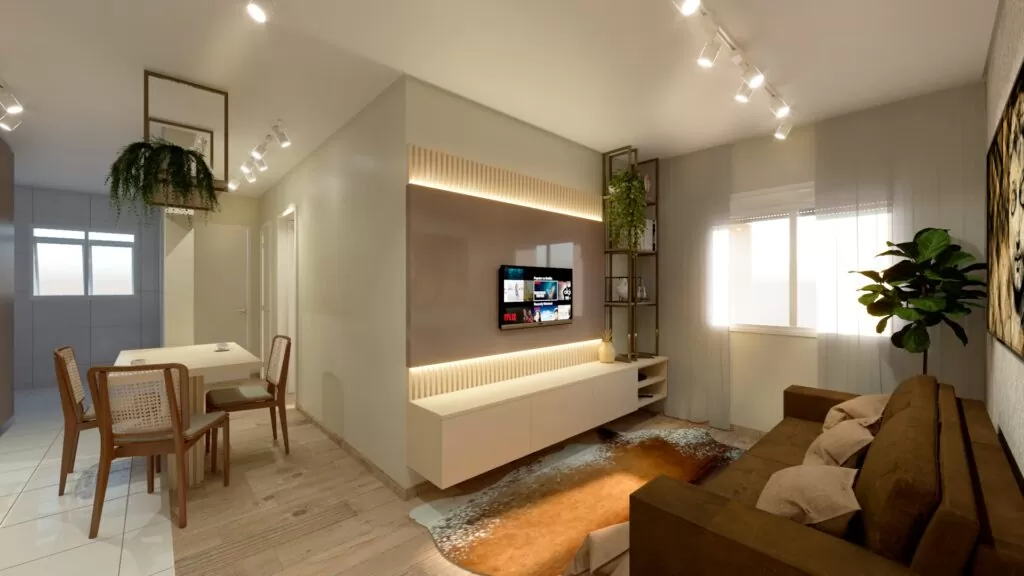O projeto de interiores, marcenaria e decoração para o pequeno apartamento de uma jovem cliente, tinha como proposta uma sala leve, funcional e barata.