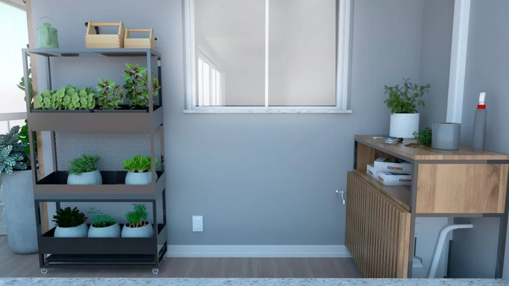 A Sacada grande mas com pouca largura, precisou de um planejamento para caber tudo que precisava. Um cantinho de bebidas, espaço de estar e o cantinho da horta para colocar as mãos na terra!